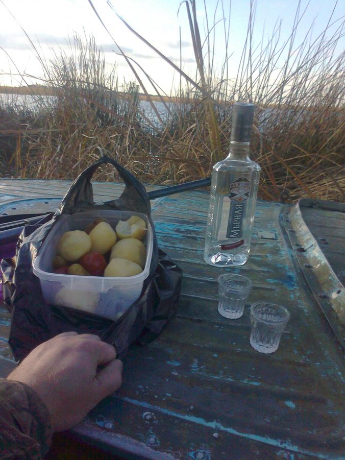 утки нет, пролетной тоже не видно, на большой воде тишина, одни бакланы. Зато наохотили на спининги клыкастых :) |