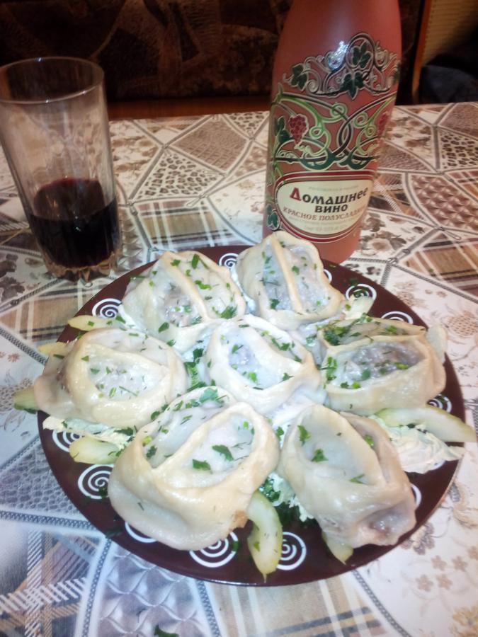 Ингредиенты: Для теста: · 1 яйцо · 50 - 100 мл воды · 1-2 столовые ложки масла растительного · муки сколько возьмет тесто Для начинки: · фарш · 2 моркови · 2 головки лука · соль · перец Приготовление: Замесить крутое тесто, которому дать отдохнуть, пока готовим начинку. На крупную терку натираем 2 моркови и 2 головки мелко порезанного лука, слегка обжариваем. В мясной фарш добавляем специи, соль, можно потереть картофелину. Тонко раскатываем тесто, выкладываем мясной фарш, на него -овощной. Сворачиваем все в плотный рулет, укладываем на смазанную маслом пароварку (можно выложить на фольгу и запечь в духовке). В воду добавляем лавровый лиcт, душистый перец и немного соли. Варить 40 минут. Выложить в блюдо, полить маслом. Подать томатный или сметанный соус. |