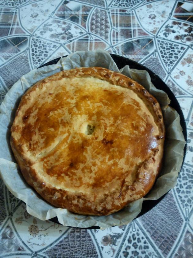 Был вынут из морозилки фарш Казахстанских щук, разморожен и обжарин на сливочном масле с мелко резаным лучком. Отварен до полуготовности стаканчик риса. Потом всё это объединяем и получаем начинку для пирога. Тесто дрожжевое покупаем в кулинарии по дороге с работы :) Делим комок на две не равные части 30% х 70%. Раскатываем. Блин 70% кладём в большую сковороду и выкладываем начинку, а блином 30% накрываем и защипываем. Взбиваем яйцо и кисточкой смазываем пирог для последующей румяности. Ставим в духовку 200 гр. до румяного цвета, т.к. начинка предварительно обработана то за "пропеченость" можно не беспокоится. И вуаля РАСТЕГАЙ!