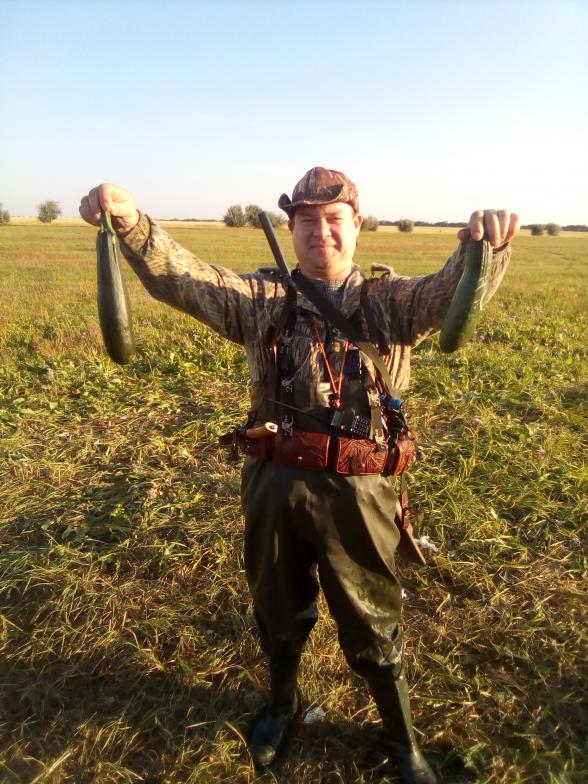 Так несолоно хлебавши вернулись в лагерь. Ужин, чай, треп, вдыхали воздух, слушали ночь и считали звезды. Что еще нужно для счастья?В этот выходной оно у нас было! Тима не раз повторил:-Папа! как здесь здорово! В палатке спали в одних трусах,хотя под утро за стенкой было не жарко. С утра побродили по лугам в поисках куликов, но везде было сухо и травища по пояс - бекасов нет! Сын предложил папе проехать на вчерашнее место и побродить вдоль камыша, в надежде поднять с подхода. Попили чаю и вперед. Но затея оказалась пустой, ни одного подъема! Решил пролезть по камышу в то место, куда накануне утянул уть, может там какая-нить баклуша есть или окошко, а может повезет.... И метров через 20 краем глаза заметил чуть заметное движение сбоку, метрах в 4.... Лысуха? Нет, кряк!!! Начал делать от меня ноги, пришлось ему с 7 метров вальнуть в очко. Простите за стилистику! Оказался молодой селех, сеголеток, еще не начал даже линять. Подранка добрали!