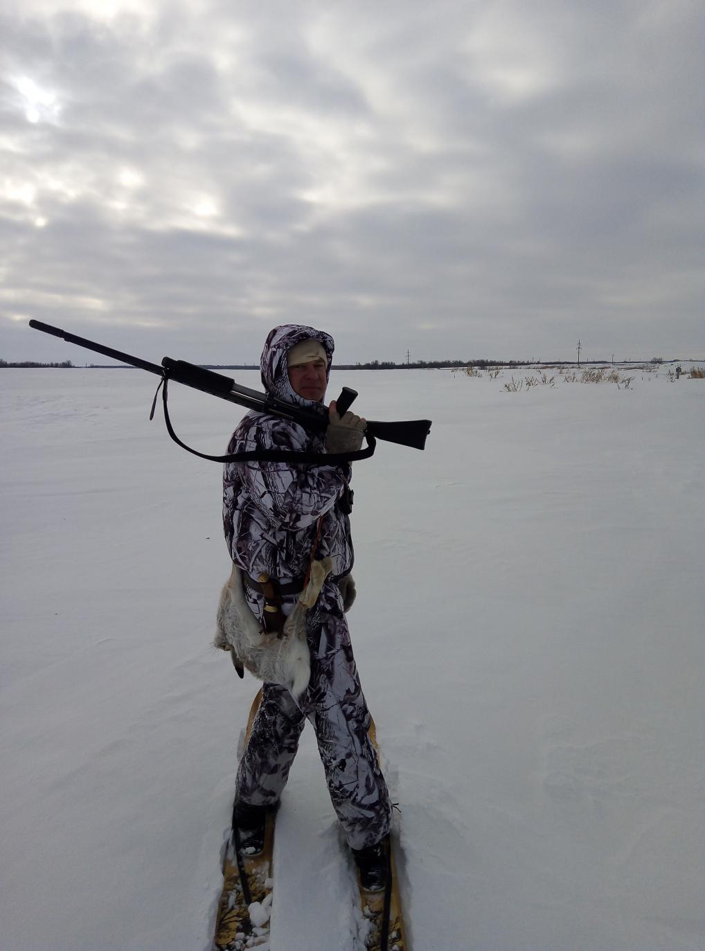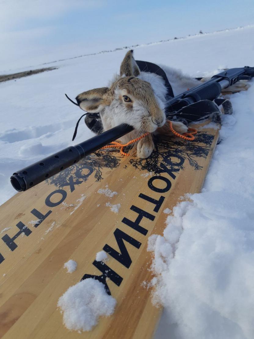 В субботу погуляли по полям. Зайка получился трудовой но взят классически. С жировки (где я взял след) провел меня через поле по дуге км 3-4 , ушел за ферму и залез в чапыжник где я распутывал его сдвойки и петли. Потом подъем из под деревца, бег вдоль бруствера, выстрел, трофей! Всё.