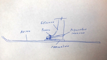 Вопрос плотной посадки ноги в лыжи я решил камерой от уазика. Нарезал ее поперек кольцами шириной 2,5-3см. Резиновое кольцо кладется на площадку, так, чтобы ремень лыжи оказался внутри кольца. Нога вставляется в ремень, а кольцо надевается с одной стороны под носок ботинка, а с другой на пятку. Результат нога зафиксирована в лыже наподобие полужестких креплений, а в случае падения резиновое кольцо растягивается и соскальзывает с носка ботинка, в результате нога благополучно и легко выстегивается из ремня.