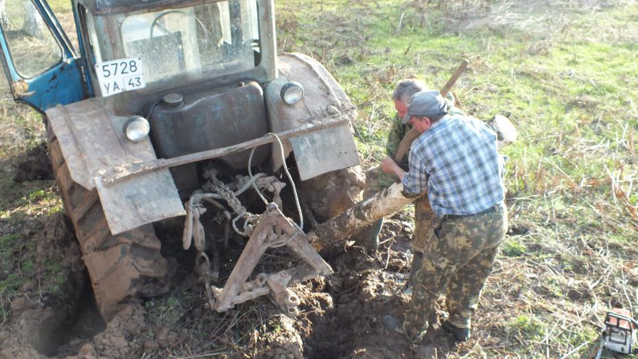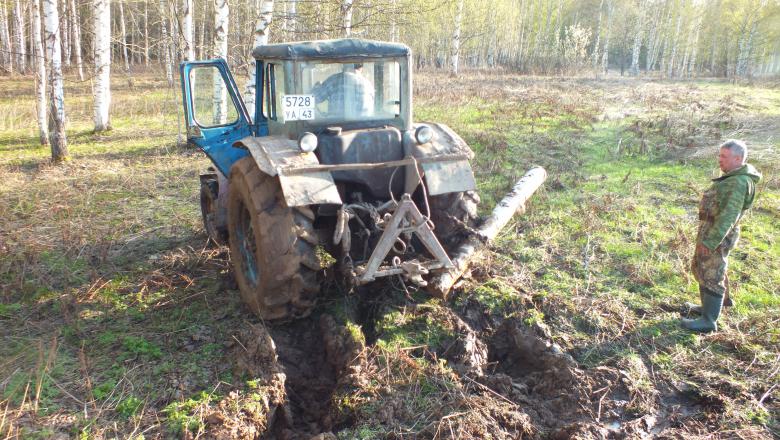 Когда грунт совсем слабый и это не работает, делают так: цепь за диск и бревно поперек