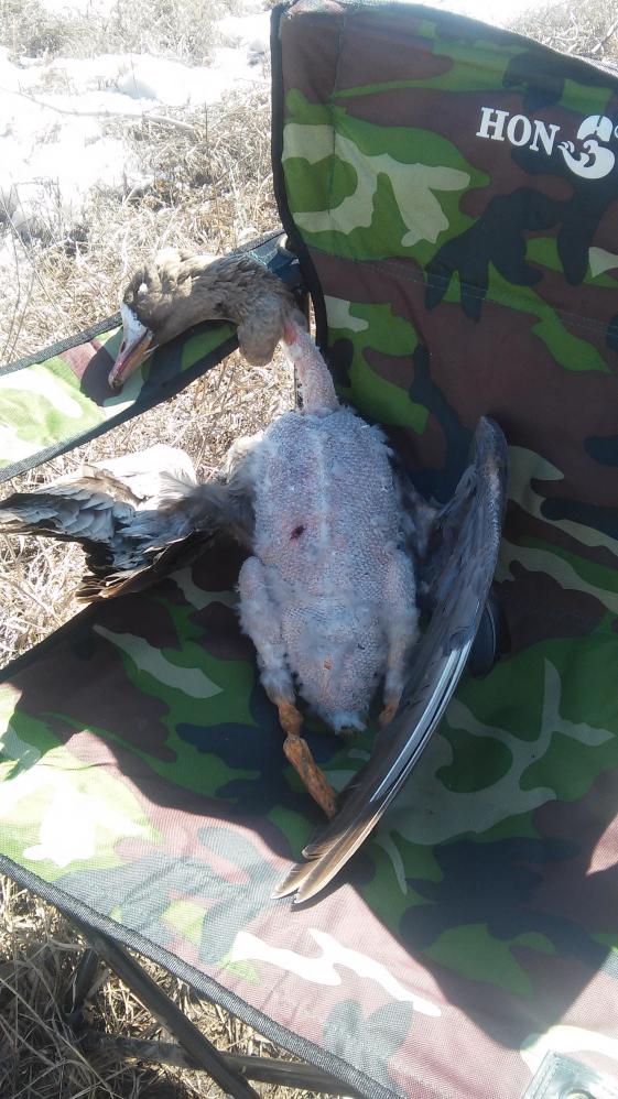 Решили отъехать на пару км от них на соседнее поле (подсолнух- не очень удачное место выбрал), ждать там налетов. Налеты были, взяли трех белолобых за утро. Вечером гусь летел по горизонту. Был налет стайки, и одиночки, который налетел со спины без голоса. Первый выстрел скосил гуся, все подумали, что ЕСТЬ и сняли его с мушек, но не тут-то было... Гусь выровнялся и наутек. Еще 7 выстрелов его не достали.(((