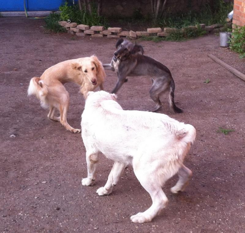 на фото серая-мать,половый-отец.Обе собаки с казахскими документами, кобель родом из хороших казахских питомников Эльхор и Байконур г.Алматы-привозился мною из Ростовской области,когда искал-ближе хороших собак не оказалось). На фото с медалями-предки кобеля.