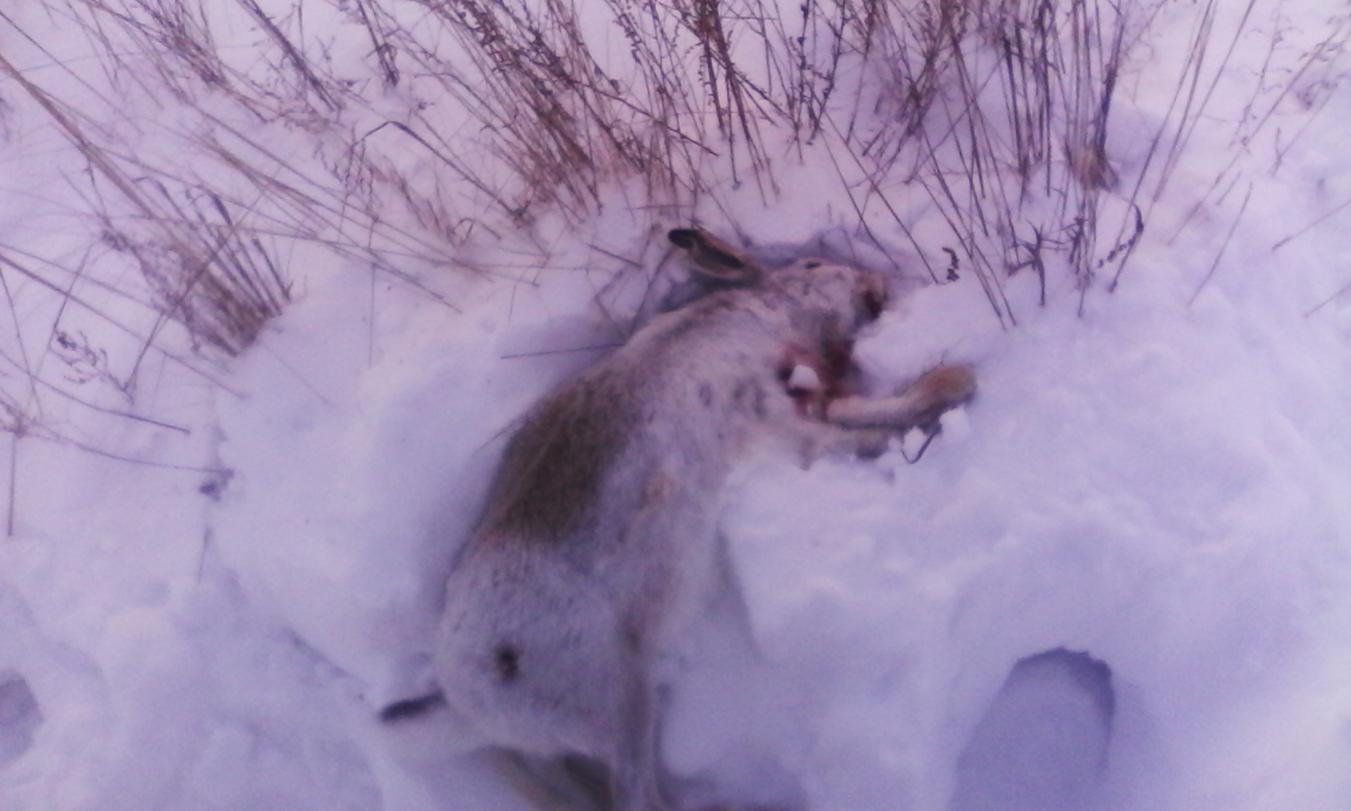 Вот заветная чаша -настоящее эльдорадо заячье, коллектор с соленой водой любят его зайцы топтать!!! на выходе из чаши возле одинокой березы замечаю неестественно взбитый снег подъехал... осмотрелся в стороне возле куста чилиги замечаю лисий покоп.... иду смотреть... подошел смотрю две норы забитые снегом под прямым углом друг к другу.... Проверяю первую пинком снег рыхлый и еще метет свист стоит в ушах.... Зайца подкинуло на пол метра -вот так номер... Пошла борьба кто кого!!! зажигаю первый мимо-тороплюсь, зажег второй летит туда куда и первый ...про себя не торопись ты не торопись, а рука жмет "гашетку" третий сгорел зацепил слегка- зайца качнуло, четвертый в угон все, финал адреналин и разбор полетов...как так я его чуть не упустил....Метель затихает маска на лице обледенела пора домой!!!