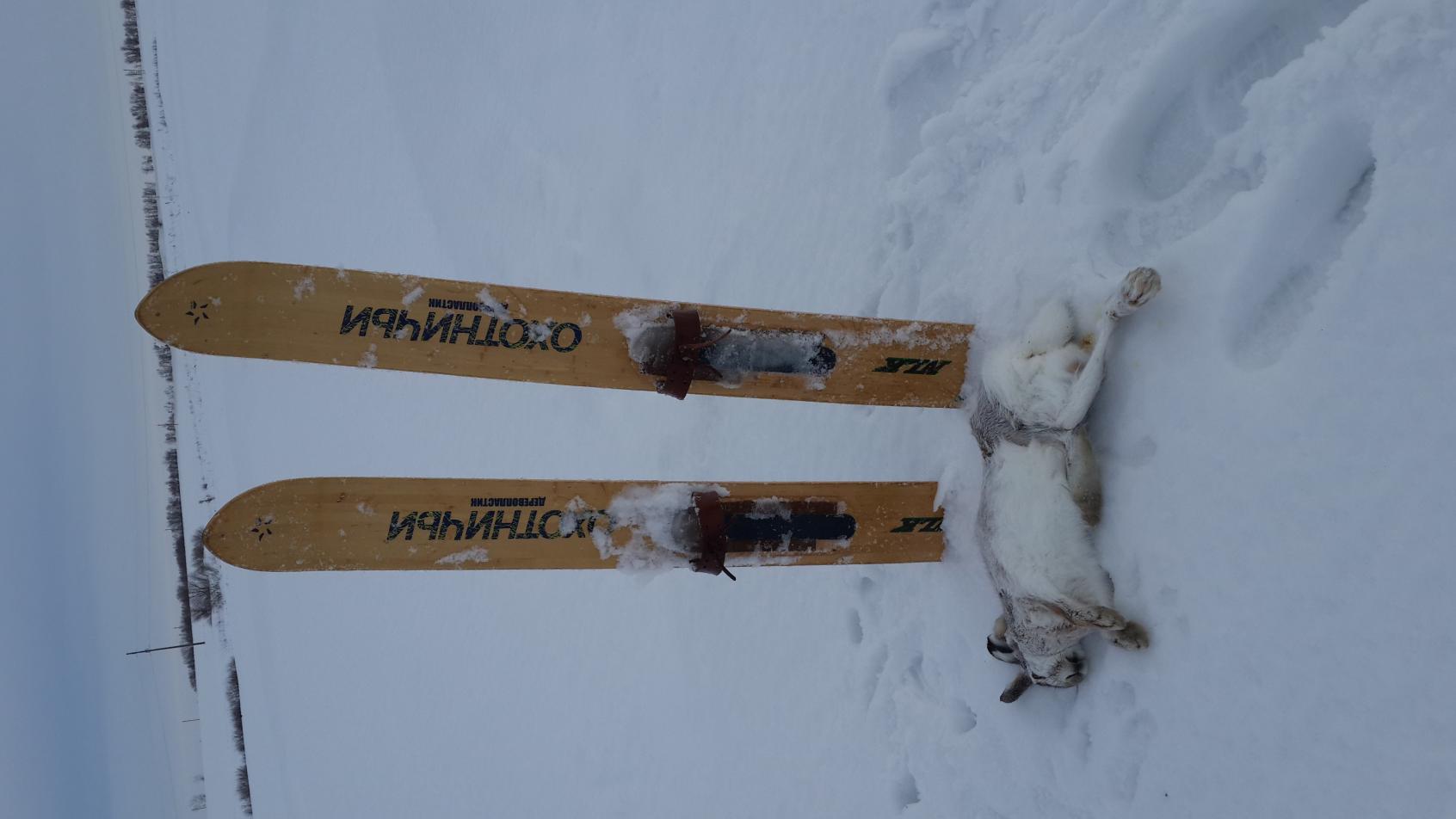 Вообщем 22 февраля я его поднимал , но как ушел с лежки так и не видел. След пошел в кустарник ну и я поперся по следу в кусты,а он лежал на краю кустарника. Следы замело моментально, ну я его и бросил в этот день. Сегодня ехал целеноправленно и пошел на его старую лежку. Лежал в 50 метрах от старой лежки в камыше, подпустил на 30 метров. Вскрытие показало зая был самец.