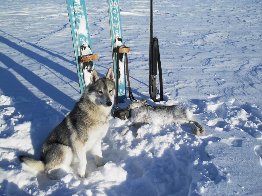 Судя по прогнозу, вчера был последний в этом зимнем сезоне денёк для тропления. Выехать получилось только после обеда. Так как крайние два выезда были по бесследице, решил навестить старого матерого, который всегда ложился в посадке, но он осторожность не потерял, удвоил, прошёл посаду вышел на дорогу и ушел в другие угодья. Других следов не было, осмотрев в бинокль окрестности, и включив воображение,"если бы я был зайцем" выбрал направление, по прямой км три .Придя в заданный квадрат, обнаружил ленту неубранного подсолнуха, там все было истоптано воронами, и о чудо зайцами тоже, обойдя по дуге жировку обнаружил три выходных следа,и все на удаление от машины. Ещё рывок км 1,5, и вот скидка, собака идет по следу не спеша, из за постоянных ветров поверхность снега как стиральная доска, поэтому след видно только под ногами, и вот собака пошла по петле, я на наперерез, вижу горку, собака сует морду, заяц делает свечку на уровне моего роста, и подставляет мне бок, первым мажу, второй третий летит пух, виснет задняя лапа, дальше собака работает. Достал из него шесть нулёвок.