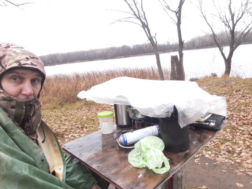 В 11 часов решил отобедать басмой с баранинкой, взятой из дома. Разогревал сидя под пленкой. Но какой кайф вкусить горячего, когда продрог под дождем и ветром. Еще бы писярик для сугреву.....