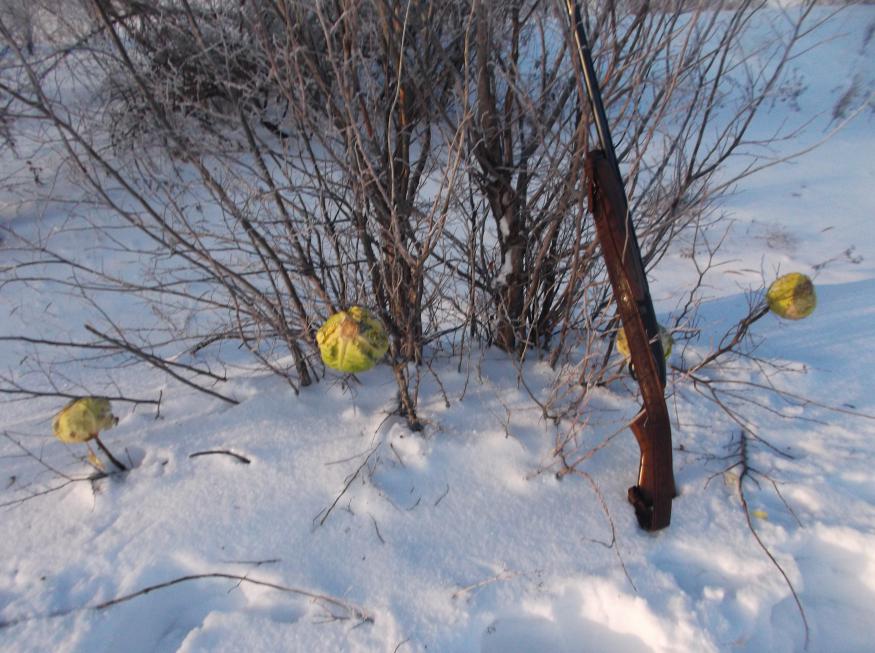 Навестил сегодня свой любимый уголок. Погодка жуть -28. Но разве это может остановить-нет, ведь выходной после ночной смены. Прихватил степашкам гостинцев в виде забытой в сенях ( естественно замёрзшей) капусты. Разложил её в месте где они постоянно транзитом гуляют. Интересно будет проверить -жрали или нет. След зая нашёл сразу. Прошёл по нему км2 и пришёл к вчерашней лёжке. Следы что сегодняшние , что вчерашние вообще не отличаются. Ну и пошёл от лёжки изучать ночную жизнь зайца. Хочу наперёд сказать ,что это был единственный след косого сегодня что я видел. Погуляли мы с ним знатно ( сказался мороз ночной). И вот на конец то выход с жировок , но прямо на железную дорогу. И прошёл он по ней не много не мало км 1.5. Два раза скидывался , но пройдя метров100 возвращался назад.Курсирующие товарняки следы зайца замели .Как я про.... скидку понял только когда возвращался назад после бесполезной прогулки вперёд метров на 300. Зай сиганул с насыпи метра на 4 на лисий след и так виртуозно прошёлся по лисьи метров 10, что сразу и не поймешь ,что это заяц. Но я его вычислил. Отошёл он от жд метров на 150 и начал делать сдвойки. Я весь на готове ,но зай тащит в кусты с пухлым снегом. Проваливаюсь по колено на лыжах. И вот он вылетает с переди с лева на право между крепкими кустами метрах в 30-35. Видел я его всего секунду. Один выстрел с упреждением пришёлся на кусты поросли клёна.Да и завысил ещё. А за кустом низина и далее озеро с осокой , в которой он невредимый и скрылся. Досадно ,но ладно.Здоровенный заяц был , я таких давно не видел.Явно не первогодок. Прошёлся на всякий случай по следу метров 100. Прыжки по глубокому снегу по 2 метра. Точно не задел. Так что до скорой встречи гигант переросток.