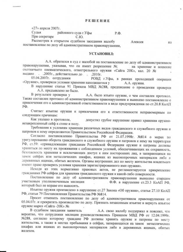 Вот решение суда по поводу возбуждения административного наказания за не закрепленный сейф (взято с Guns.ru)