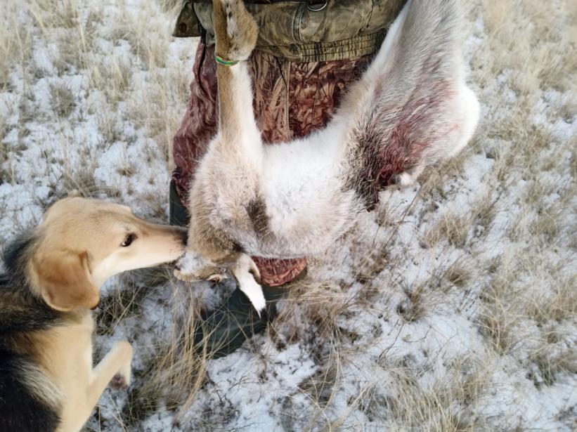 Делаю примерное упреждение и спускаю курок. Выстрел и задние лапки показались выше травы. Один подъем, один выстрел, один трофей.