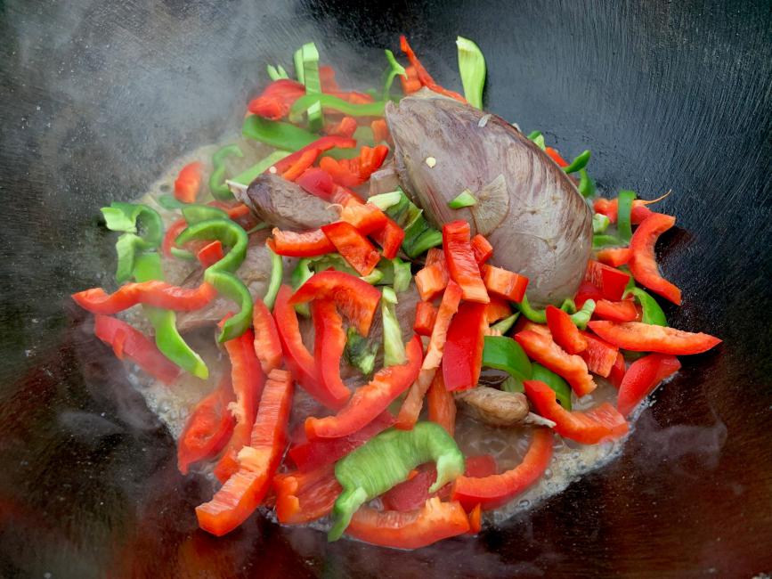 В) Добавляем болгарский перец, он даст свой сок, а значит и вкус – тушим 10 минут.