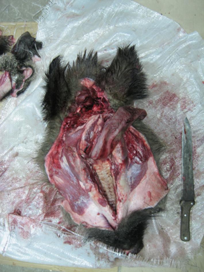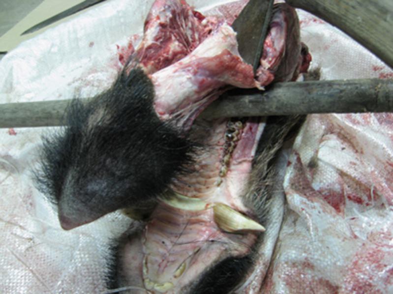 -вставляем палку между нижней и верхней челюстью, чтобы при рубке зубы не сломались друг о друга.