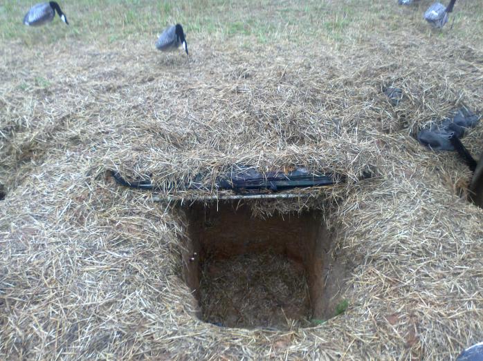 Выкопали ямы, привез я соломы в мешках с соседнего поля, палками загородили ямы сверху,замаскировались. И вот раннее утро, все действующие лица на местах (кроме гусей). Зарядил дождь. Погода мерзость. Температура +5, ветер. С 5 до 8-30 ни одного гуся, ни одного крика гусиного, мы все мокрые как мыши, змЭрзли як мокрые кошки на морозе.