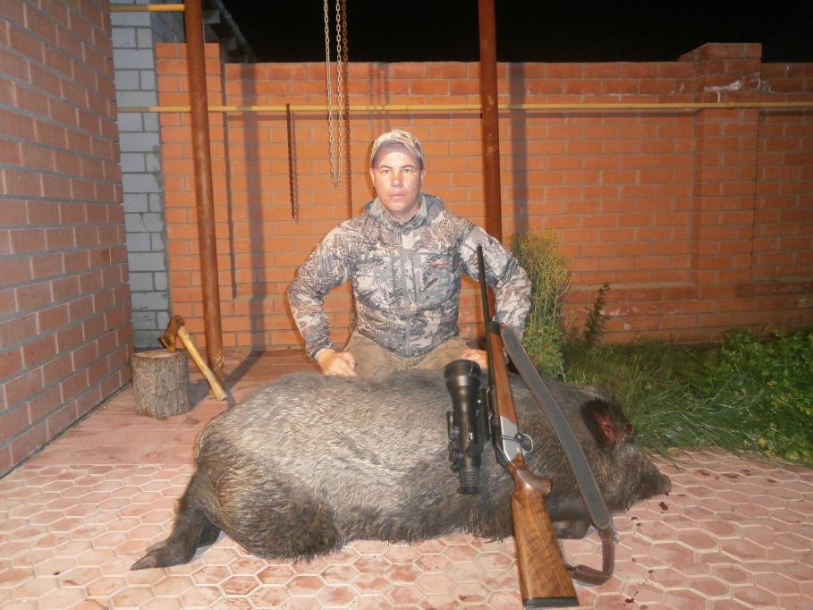 Ночь, подход 200 метров, стрелял в штык. Калибр 308 win, пуля Лапуа Мега 185 гран, вошла в лоб и застряла на спине под шкурой!