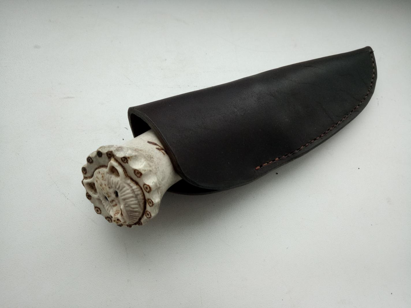 Цена: 6500 рублей. Клинок: Длина клинка: 125 мм. Ширина клинка: 37 мм. Толщина обуха: 3,5 мм. Спуски от середины. Сталь ХВ5 - одна из легированных инструментальных сталей, которые используются для создания резцов и других металлорежущих инструментов, обрабатывающих особо прочные виды чугуна и стали, и других инструментов. Больстер: латунь с орнаментом торца "битый камень". Рукоять: Рог лося с резьбой головы кабана на тыльнике и пирографией на рукояти. Проставка - африканское черное дерево (african blackwood) - Dalbergia melanoxylon. Ножны: КРС хромового дубления с обработкой торцов Токонолом и финишным водоотталкивающим покрытием. Вощеная нить 1 мм. Последний раз редактировалось Хитрый Бобер; 07.02.2019 в 09:09. |