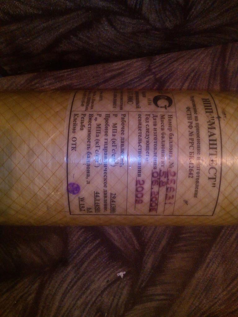 Баллон заправлен воздухом. Брал для акваланга, как 3-й запасной. Лежит без дела, т.к. 2-а имеющихся по мимо него использую. Поверка баллона была в 2015 г. Мастер клеймо не набил по понятным всем причинам, но заправляет он же. По торгу - есть телефон, звоните.