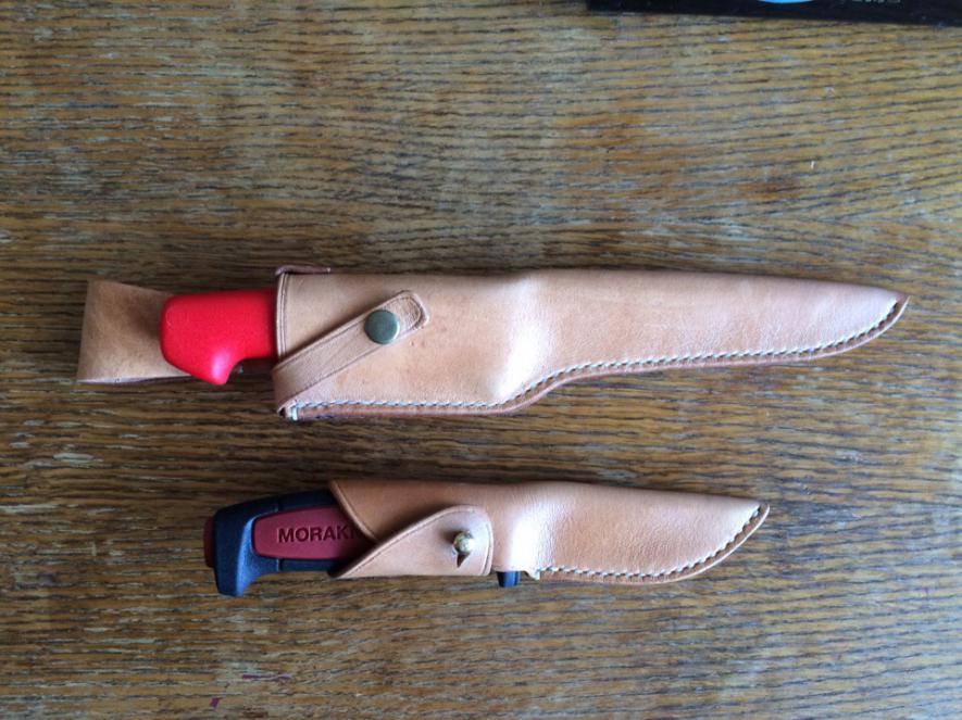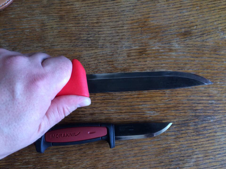 2) Нож мора,для тяжелых работ по замороженным продутам(мясо рыба),отлично подойдет для любых хоз быт работ,походов,ну и конечно охоты. Длинна клинка 150 мм,толщина 2,5 мм.ширина 22мм,угол заточки 23%,сталь высоко углеродистая,с завода нанесено какое то покрытие ,нержавеющая,хвостовик в рукоятку входит на 3/4,не выломаешь при желании. Рукоять крупная,под любую руку подойдет,материал полипропилен,цвет красный(захочешь не потеряешь в лесу)!. Ножны шил на заказ,с двумя подвесами,на ремень и свободный,натуральная кожа. Без походного пробега,дома мяса прибалдел порезал)! даже в жирной руке сидит уверенно,передний под пальцевый упор сильно развит,но сделан под таким углом что не мешает работе с продуктами,для людей сделано,нож очень могуч и резуч. Цена с ножнами 1700р. При покупке обоих ножей,небольшой торг.