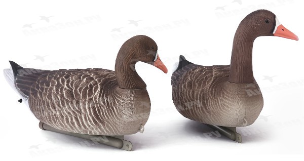 Чучела огружены грузами, с леской и резинкой для крепления на киле гусей.