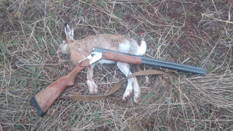 25.10 не смог проехать в намеченное место из-за грязи, поэтому решил топать от асфальта в другое. Это небольшая ложбина, заросшая шелковистой травой с холмом посередине и рядом "зеленка". Пошел по кругу вдоль границы участка "челноком". Головой крутил влево-вправо, но подьем зайца не увидел. Он мелькнул на вершине холма, идущего по середине всей ложбины и скрылся. Выбежал на холм, прошел обратно к месту, где заходил в ложбину, но зайца не обнаружил. Пошел обратно, челноча, но теперь с другой стороны холма. Почти дошел до конца ложбины, но что-то потянуло меня на сам холм, заросший высоким ковылем. Опять пошел обратно по холму, осматривая местность ниже справа. Прошел метров 20 и тут услышал звук подьема зайца. Встал метрах в 10, но я его не видел, пока он не свернул влево и не понесся вниз в сторону зеленки. Я его взял на мушку, как только он показался из травы. Боковой выстрел метрах в 40. Патрон "3" БК, попадание первым. Вес 4700.