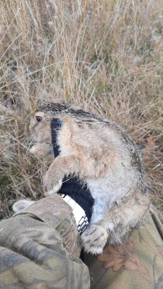 Осеннюю охоту люблю, потому что понимаю, где искать в это время года зайца. Главное- хорошо изучить охотугодья, где охотишься. Где зимой видел зайца, там и осенью он будет. Каждый год, у меня, это подтверждается. Первого зайца добыл 29.09.23. Участок местности имел много небольших и не глубоких ям: как будто после бомбежки, с травой и травяными кустами. В одной он и лежал под таким кустом. Выскочил метрах в 10 и прикрываясь за травой понесся вперед, но потом резко уменьшил пыл. и побежал медленнее, подпрыгивая, как косуля Стрелял в угон "3" БК. Попал первым в голову.Вес 3700.