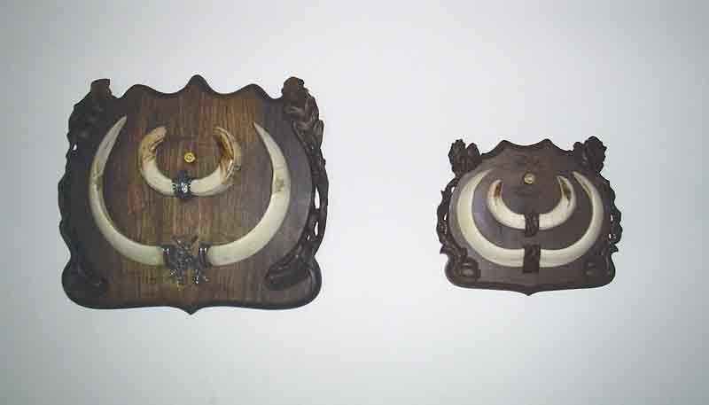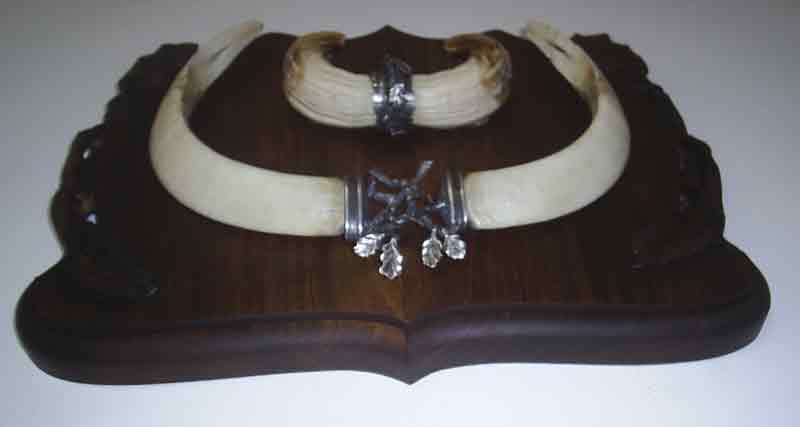 подряд клыки, а для самых крупных и красивых делают медальоны резные из ореха. Резьбой у меня занимается отец, он вырежет любой медальон и посоветует эскиз, цена зависит от сложности. Оформить на простой или резной медальон решать Вам, в любом случае - Это ВАША память об охоте, которую не вернешь.. Кто бывал на охоте в Европе видел оформление замков ((фото Чехия, музей охоты))