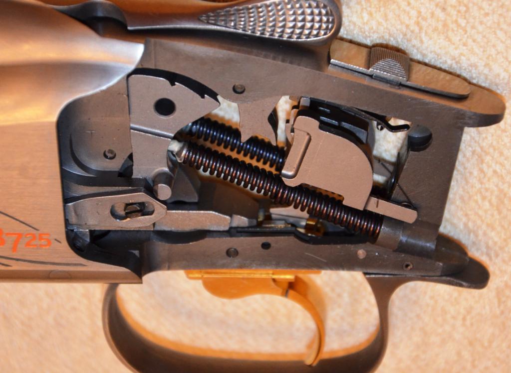 При спуске курка, распрямляющаяся пружина подбрасывает корпус селектора вверх, переключая спуск на другой ствол.