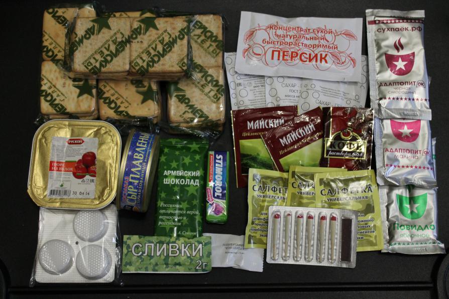 В большинстве ИРП есть мясные, мясо-овощные и овощные консервы, каши, сыры, сало, рыба, повидло и фруктовые пюре, галеты из черного и белого хлеба. А также НАТУРАЛЬНЫЕ тонизирующие напитки. В случае если нет питьевой воды, в сухих пайках есть средства обеззараживания воды, витамины. В некоторых есть шоколадка или шоколадная паста и жевательные резинки. Для разогрева продуктов, в комплекте сухпайка идет портативный разогреватель, а для разведения огня - спички спецназ, которые горят даже под водой. Всегда в комплекте также ложки, влажные и сухие салфетки, приправы и многое другое.