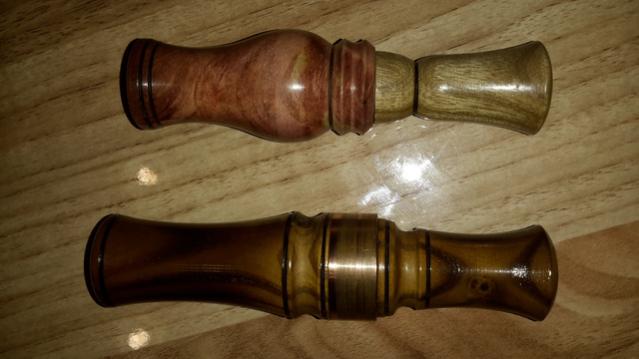 Красноватый манок, сделан из двух видов стабилизированной древесины, а другой тоже сделан из двух видов, только по дереву если честно забыл. Но точно что не красного и чёрного.