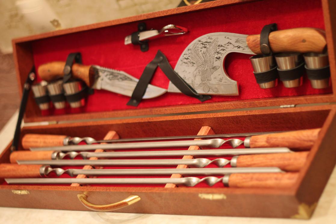 Набор охотника (туриста). Комплектация: 1) нож туристический — 1 шт., 2) чехол для ножа — 1 шт., 3) топор — 1 шт., 4) шампур — 6 шт., 5) штопор — 1 шт., 6) стакан маленький — 6 шт., 7) коробка кожезаменитель — 1 шт. Отдам за 4500 руб.