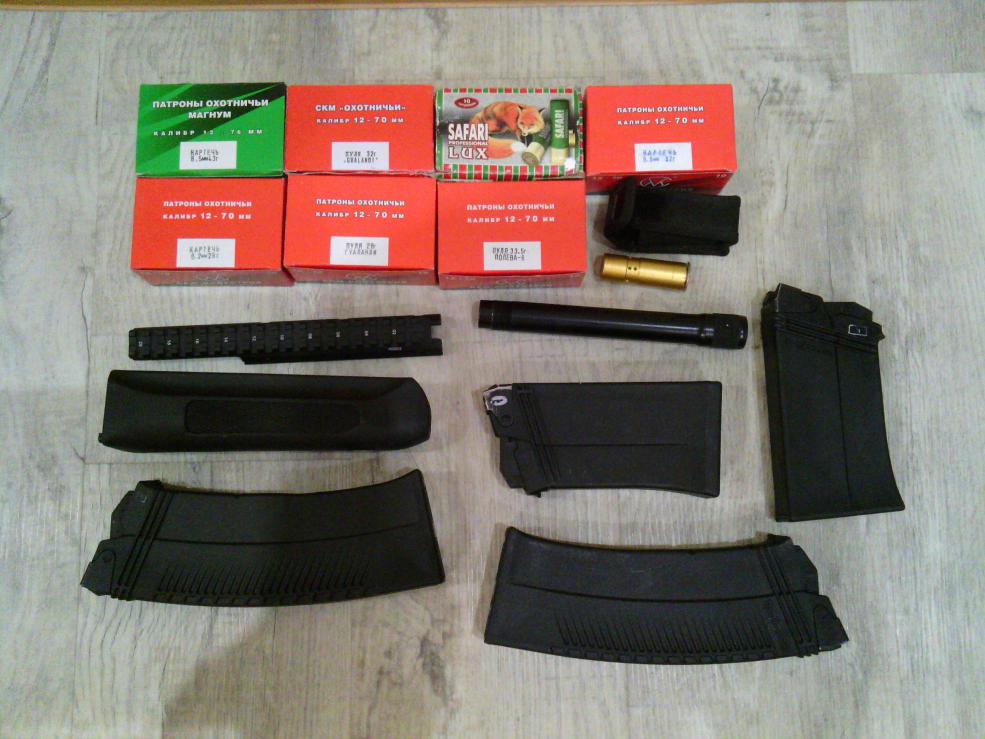 Сайга 12к ствол короткий, есть насадка для удлинения ствол. так же в комплект в ходит цевье с планками вивер (длинной и короткой) и родное. Ручка тактическая с сошками, коллиматор прицел, ДТК Ильина, два магазина по восемь патронов и два по пять. Патрон холодной пристрелки, ремень трех точечный, восемь коробок патронов (в основном пуля и картечь). Набор для чистки оружия (шомпол и три насадки) на фото нет и сейф в придачу ( тоже на фото нет, обычный металлический для Сайги как рас). В подарок крышка хрен знает от кого, но с планками вивер (фото выложу).