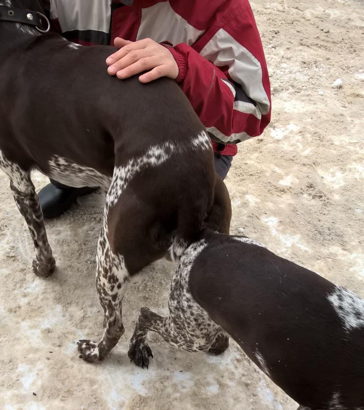 Парни,чисто кофейного окраса щенков нет,только кофейно-пегие с небольшим наличием светлых пятен на общем кофейном фоне.Сейчас найду и выложу фото обоих родителей во время вязки-посмотрите.Слева мой кобель,видно что он крупнее суки.