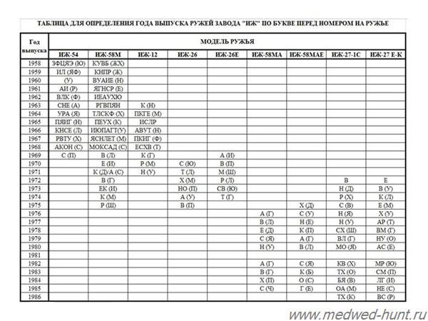 Привет из Челно-Вершин Приобрел вертикалку ИЖ-27Е 16 калибра Заводской № Н11968 Как правильно определить год выпуска? По прилагаемой таблице буква Н встречается 2 раза - 1979 и 1985 года