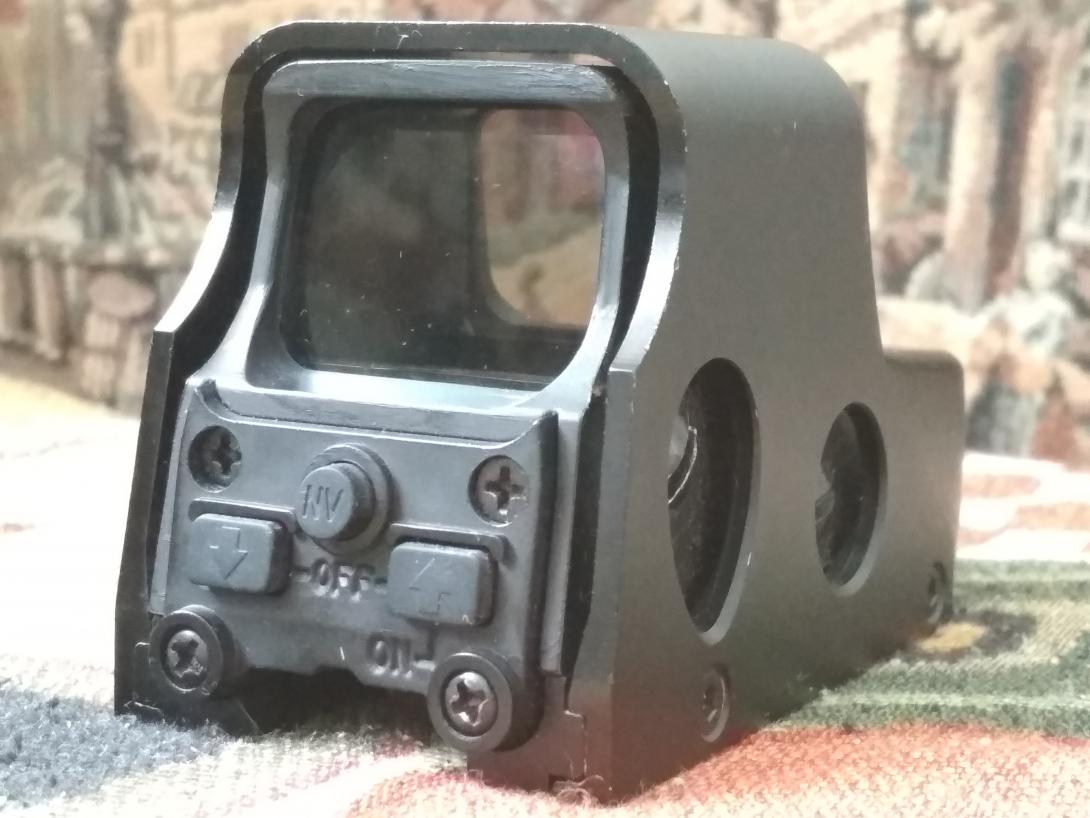 Коллиматор! Не голографический. Марка точка в круге с рисками, универсальное питание 4шт лр44(в любом магазине есть) . Регулировка яркостимарки и 2 цвета(красный зеленый