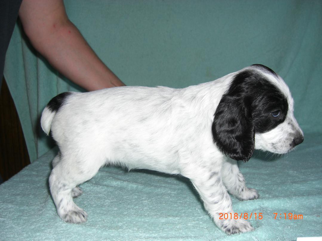 8 щенков: 5 кобелей (4 черно пегих, 1 рыже пегий) / 3 суки (2 черно-пегие, 1 рыже пегая).
