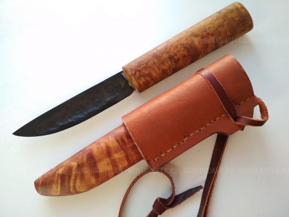 Нож якут под левую руку продам. Кованая У10А. Клинок зачернен немецким составом для воронения. Линза, сведен в ноль. Обух имеет форму клина. Рукоять карельская берёза, пропитка немецким составом на основе льняного масла. Ножны - еловый кап и кожа КРС. Свободный подвес. Нож в ножнах сидит плотно. Предлагаю за 2700.