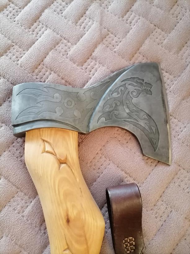 Ну раз есть спрос, то у меня есть что предложить,высокоуважаемому сообществу: авторский топор "Драккар". Голова 1980года выпуска, формовка, глубокое травление, варонение, пропитка оружейным маслом. Топорище резное из комеля сибирской берёз. Чехол из итальянской кожи с тиснением. Цена 15000р..