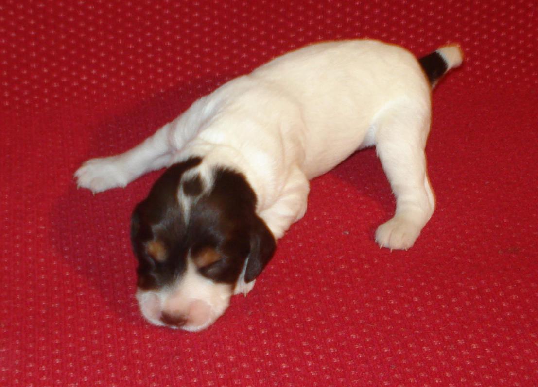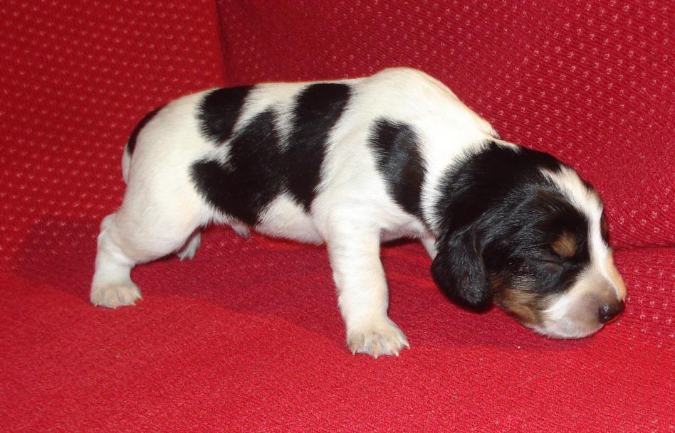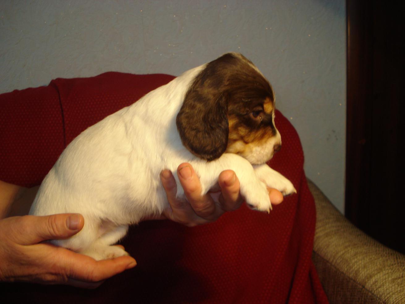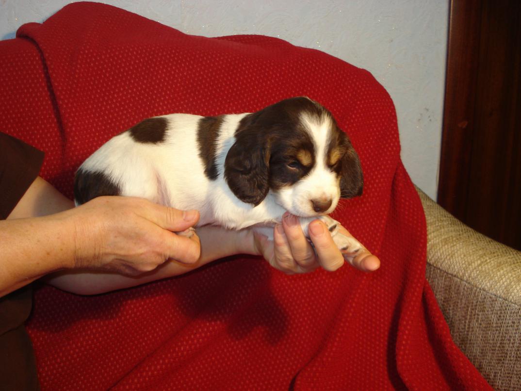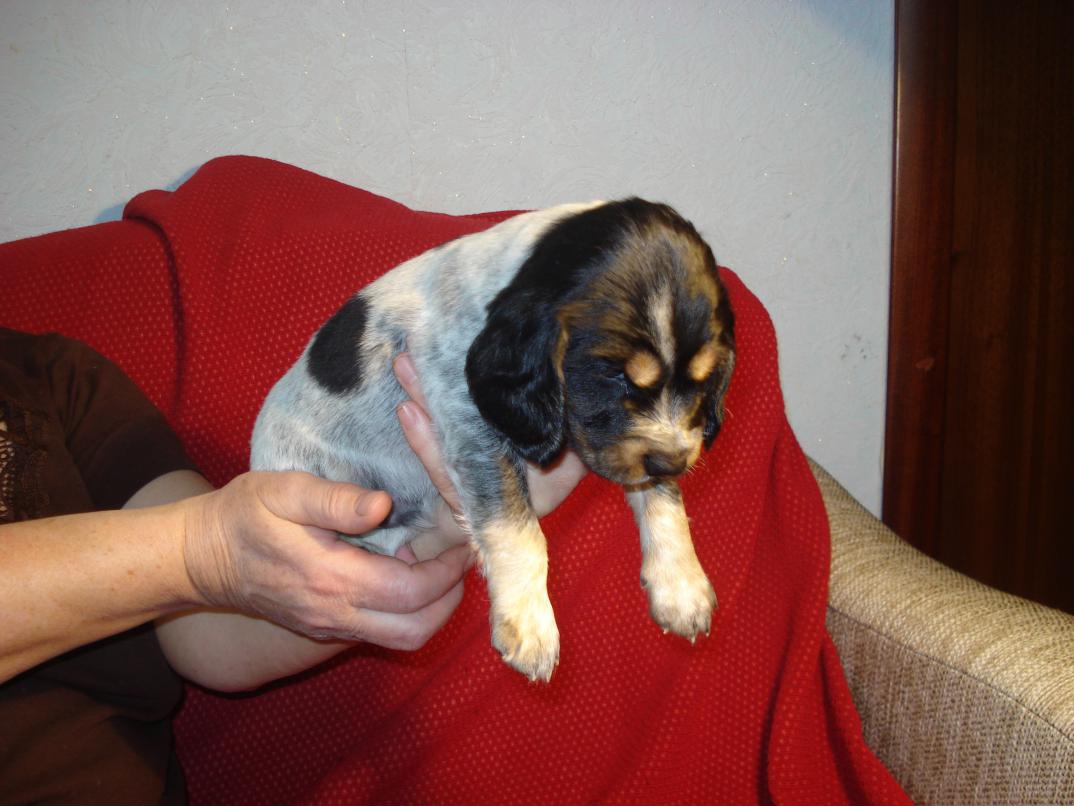 4. Кобель Черно -пегий в крапе с подпалом. Выбран.