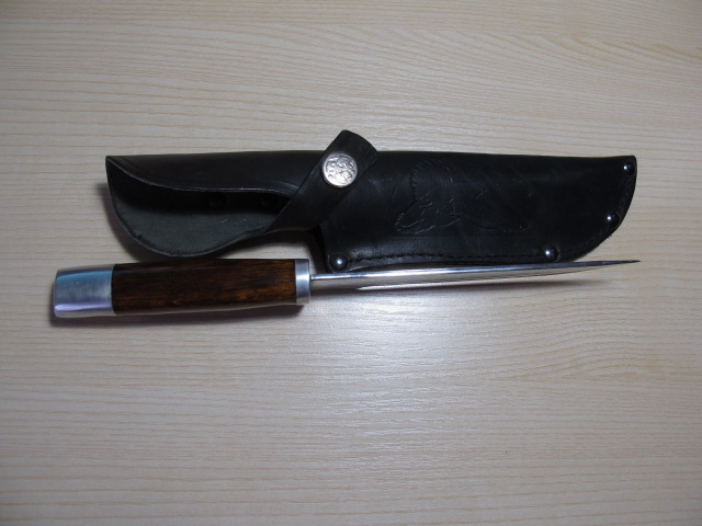 Материал рукоятки - дерево. По части лезвия рисунок - травление. Кожаные ножны коричневого цвета.