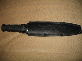 Рукоять эластрон. Ножны кожа. Клинок полированый.
