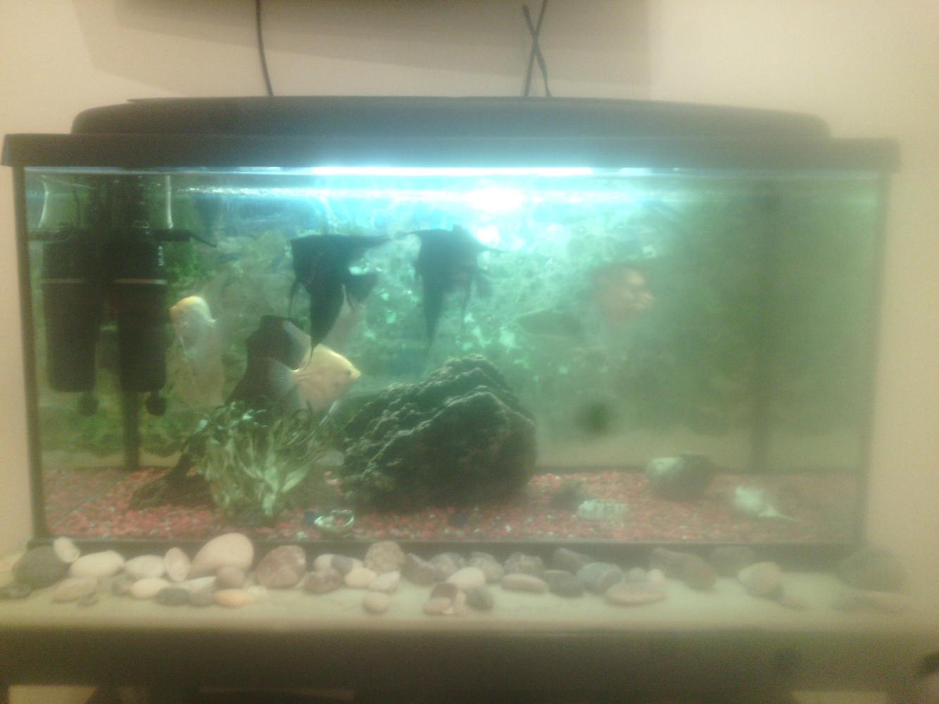 Продам аквариум на 70 л. Фильтр подогрев свет грунт камень корень + 7 скалярий 2 сома присоски 2 сома пятнистых возраст год. За 5тр