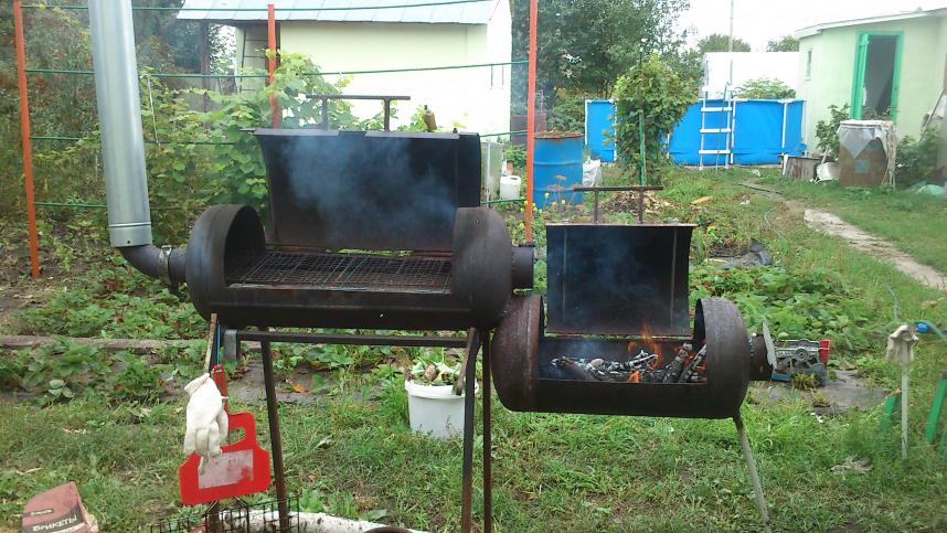 Нормалёк!!! Получается из маленького нижнего дым в верхний идёт - это уже коптилка. Ссылка на чертежи есть? Люблю поковырятся с железом и сваркой.