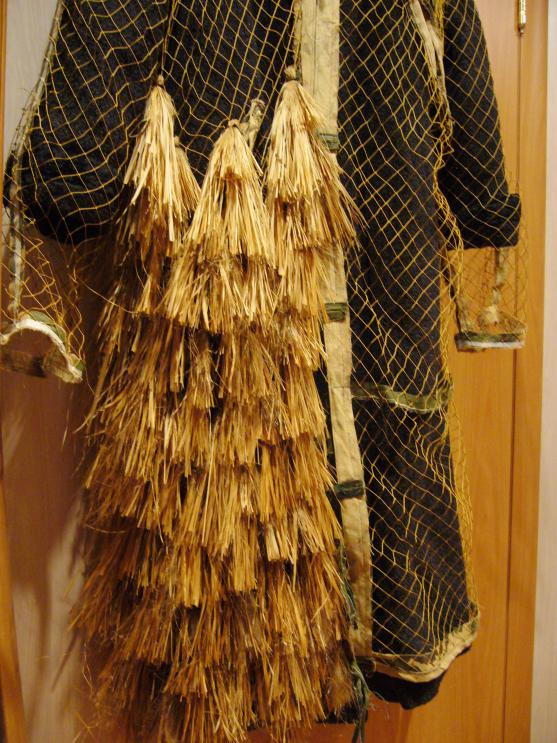 Ну вот, закончилась работа над первым костюмом, выложу что получилось. Вязалось лыко с добавлением льна, соотношение 70/30 % на сетку под бредень, ячейка 20х20. Предварительно сетка варилась в луковой шелухе, по ликало, снятым с халата. Сетка вырезана и края пришиты к полоскам из ткани. В итоге заготовки были сшиты в одно целое.