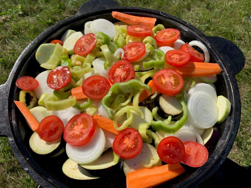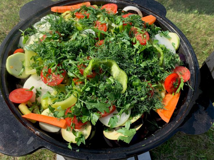 Масла растительного налил грамм 100 и запустил в него, как нагрелось, ребрышки, далее по кругу уложил все овощи слоями – баклажаны, цукини, лук, перчик, морковь, помидор (она всегда последим слоем), следом добавил мясо на кости и снова один слой всех овощей. Сверху добавляем чеснок и зелень порубленную. Каждый слой мяса солим, остальные слои (овощи) на Ваше усмотрение, но лучше посолить потом (жалко будет очень если пересолите). Как закипел бульон, постарайтесь убавить жар и томите на медленном огне в течении 2,5 часов. Подавать со свежей порубленной зеленью. Рюмка водки под такое блюдо крайне необходима!