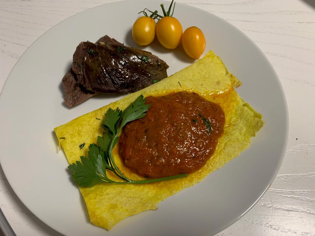 Ж) Утку выкладываем на тарелку, на лаваш, а тушеные овощи взбиваем блендером, не ленитесь, - это очень важно.