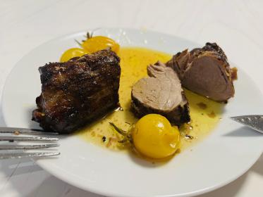 Укладываем в форму с чери помидоркой и розмарином (веточка одна) и заливаем тем же рассолом из маринада или свежим сухим вином.