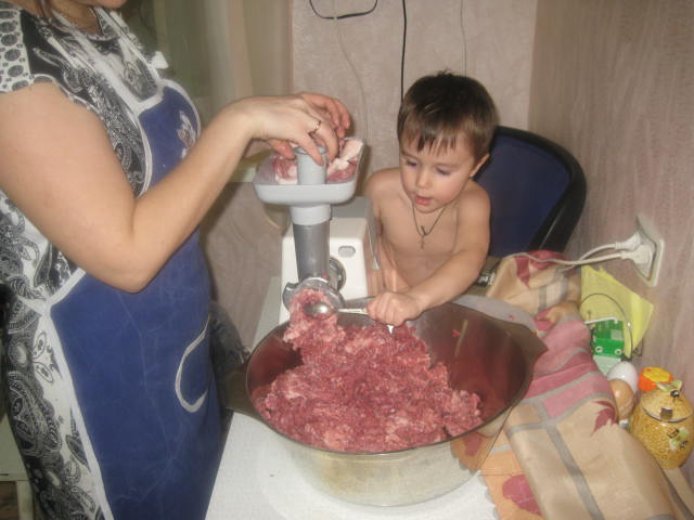 А вот семья крутит фарш из кабана.И старшего ребенка и этого младшего к охоте приучаю.К работе с мясом,младший фарш помогает крутить,а старшая намедни так пенек расстреляла!