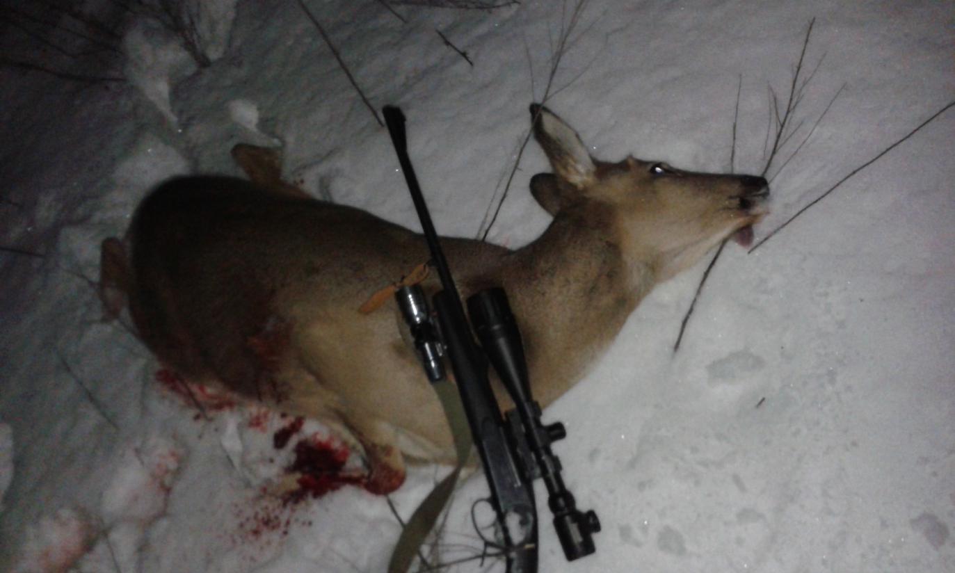 Несколько напрягала погода, температура просто ажур, но вьюжило... Снег лепил глаза. В загоне 2 человека + 2 собачки. Стрелков 7 человек. Получилось всего два загона, первый короткий - проглядели выход зверя. Второй очень длинный, случился подранок - лёгкий, но собаки ушли за зверем. Пришлось искать, добирать. Удалось только в 18.30 - было уже темно, но четвероногие молодцы. Сработали на славу. Держали до подхода охотников. Добрали практически в упор с 15-20м. картечью - 8,5 мм... Результат - подсвинок 65 - 70 кг. Спасибо всем участникам охоты. До встречи...