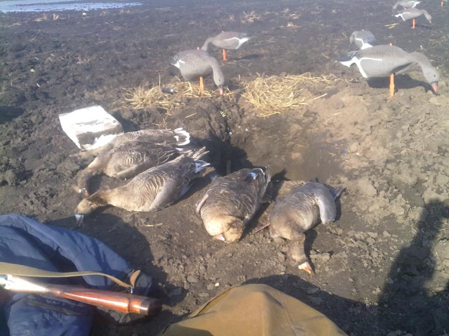 Сделав работу над ошибками,появился результат.Манить стали умеючи,переделали маскировку,перестали лениться рыть яму, на троих приобрели 70 полнокорпусных чучал и главное переосмыслили весь процесс охоты на гуся.На шару охота на гуся не получится. Теперь главное разведка: поиск кормового поля, поиск гусиных испражнений.